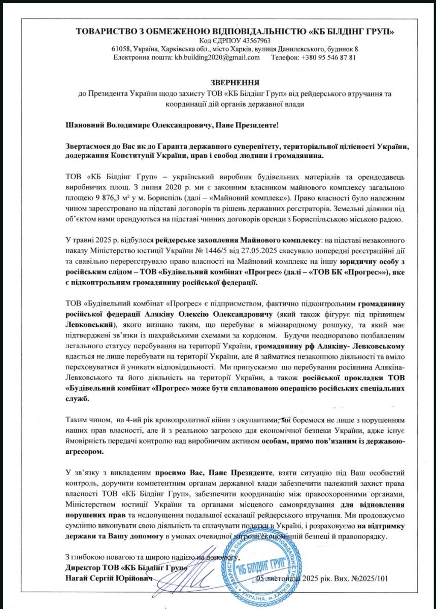 У публічному доступі з’явилося звернення керівництва ТОВ «КБ Білдінг Груп» до Президента України Володимира Зеленського з проханням взяти під особистий контроль ситуацію, пов’язану із рейдерським захопленням майнового комплексу компанії у Борисполі. За твердженням підприємців, у травні 2025 року право власності на виробничий об’єкт площею майже 10 тисяч м² було скасовано рішенням Міністерства юстиції, після чого майно було переоформлене на іншу юридичну особу - ТОВ «Будівельний комбінат “Прогрес”», що має цілком конкретні російські корені.