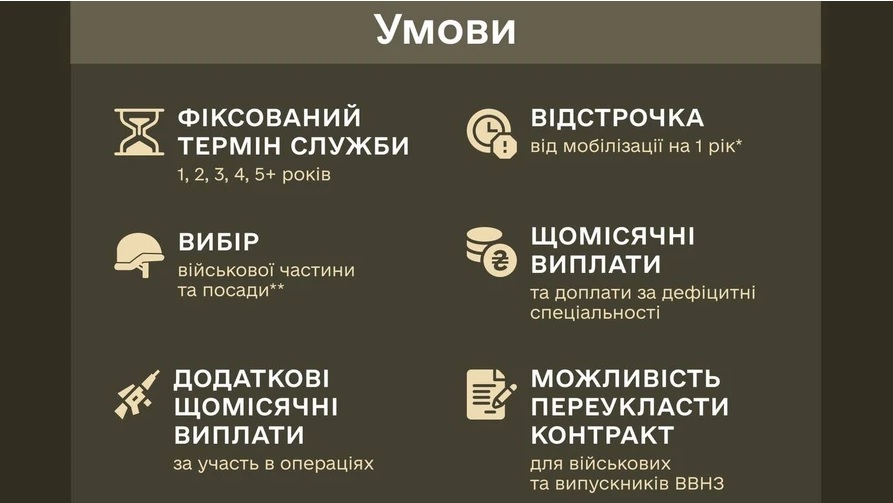 За його словами, головна новація полягає у встановленні чітких термінів служби – від одного до п'яти років. Для контрактів тривалістю 2-5 років передбачатиметься річна відстрочка від мобілізації після завершення служби.